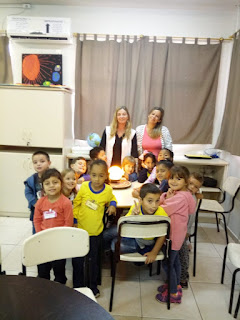 Nessa sexta-feira (24/05) a Escola Herondina recebeu uma visita muito especial dos estudantes do G6 do NEIM Ingleses II, das professoras Adriana e Deise. A turminha veio participar de uma aula diferente sobre Astronomia no Laboratório de Geografia com a professora Tânia Márcia Machri Ferreira.
